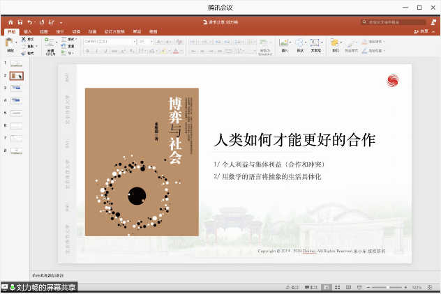刘力畅同学分享的是《博弈与社会》一书,本书用通俗的语言,系统地介绍了博弈论的基本方法和核心结论,并应用这些方法和结论深入分析了各种各样的社会问题和制度。刘力畅同学通过书籍用数学的语言向我们讲述了怎样解决个人利益与集体利益之间的合作与冲突。让我们了解到,学术研究不一定枯燥乏味,而是同样可以充满趣味。