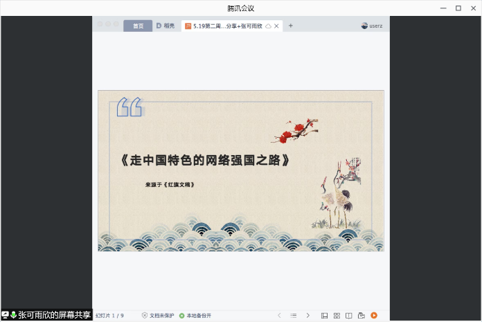 张可雨欣同学分享的是《走中国特色的网络强国之路》,文章来自于《红旗文稿》。她结合自身体会,从信息化、现代化、网络安全与国家安全四个方面,认真分析了网络给我们的生活所带来的的利与弊。在信息化与现代化已成为世界各国战略重点和优先发展方向之际,她呼吁我们当代青年大学生应理性对待网络这把“双刃剑”,把其作为开阔眼界、增长学识的有效工具,拒绝不健康的精神污染,克制使用网络的时间,坚定爱国信念,做一位中国好网民。