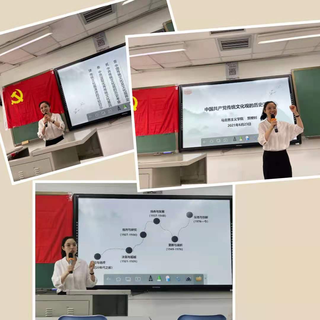 贾桠钊老师从中国传统文化及文化观界定、中共传统文化观的历史考察、中共汲取优秀传统文化基因、传统文化观演进的经验启示四个方面进行了生动的讲座。首先,贾老师用一则短片向大家说明了中华优秀传统文化及文化观的内涵。接着,她重点介绍了中国共产党文化观在六个不同历史阶段的具体特征以及陈独秀、李大钊、毛泽东等对中国传统文化的批判与继承。最后,她从“在历史中总结马克思主义与传统文化融合的经验、在实践中推动中国传统文化的现代性转化和发展、在融合中提升马克思主义中国化发展维度和高度”三个方面总结了传统文化观演进的经验启示。