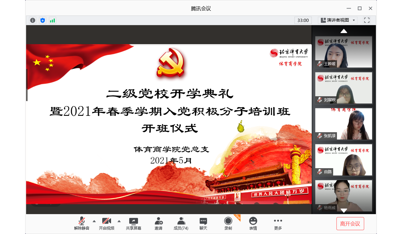 2021年5月21日体育商学院二级党校举办开学典礼暨2021年春季学期入党积极分子培训班开班仪式,学院68名入党积极分子参加首期培训班学习。学院党总支副书记戴旭、党总支委员蒋岩岩、辅导员李雅雅和滕晓键出席开班仪式。仪式由组织员颜世琦主持。