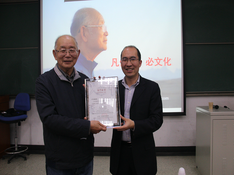卢老师还与现场的同学就中国传统体育文化的传承等问题进行了交流。整个讲座持续了90分钟,来自不同学院和学科背景的近150名本科生、研究生和老师聆听了讲座。管理学院李圣鑫副院长主持讲座并为卢元镇教授颁发了荣誉证书。