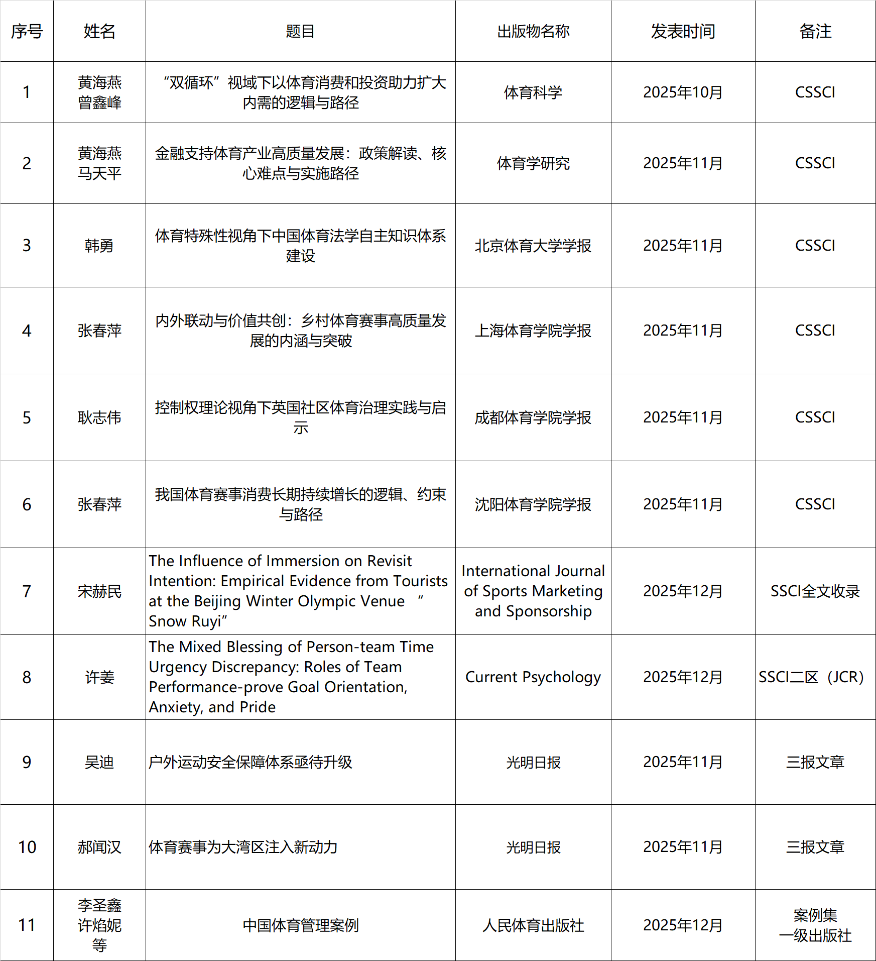 2025年10月-12月,我院有10名教师文章在《体育科学》、《北京体育大学学报》、《上海体育学院学报》、《光明日报》、《Current Phycology》等重要学术期刊报刊共发表8篇学术论文(含2篇SSCI论文),在人民体育出版社出版体育管理汇编案例集一本。
