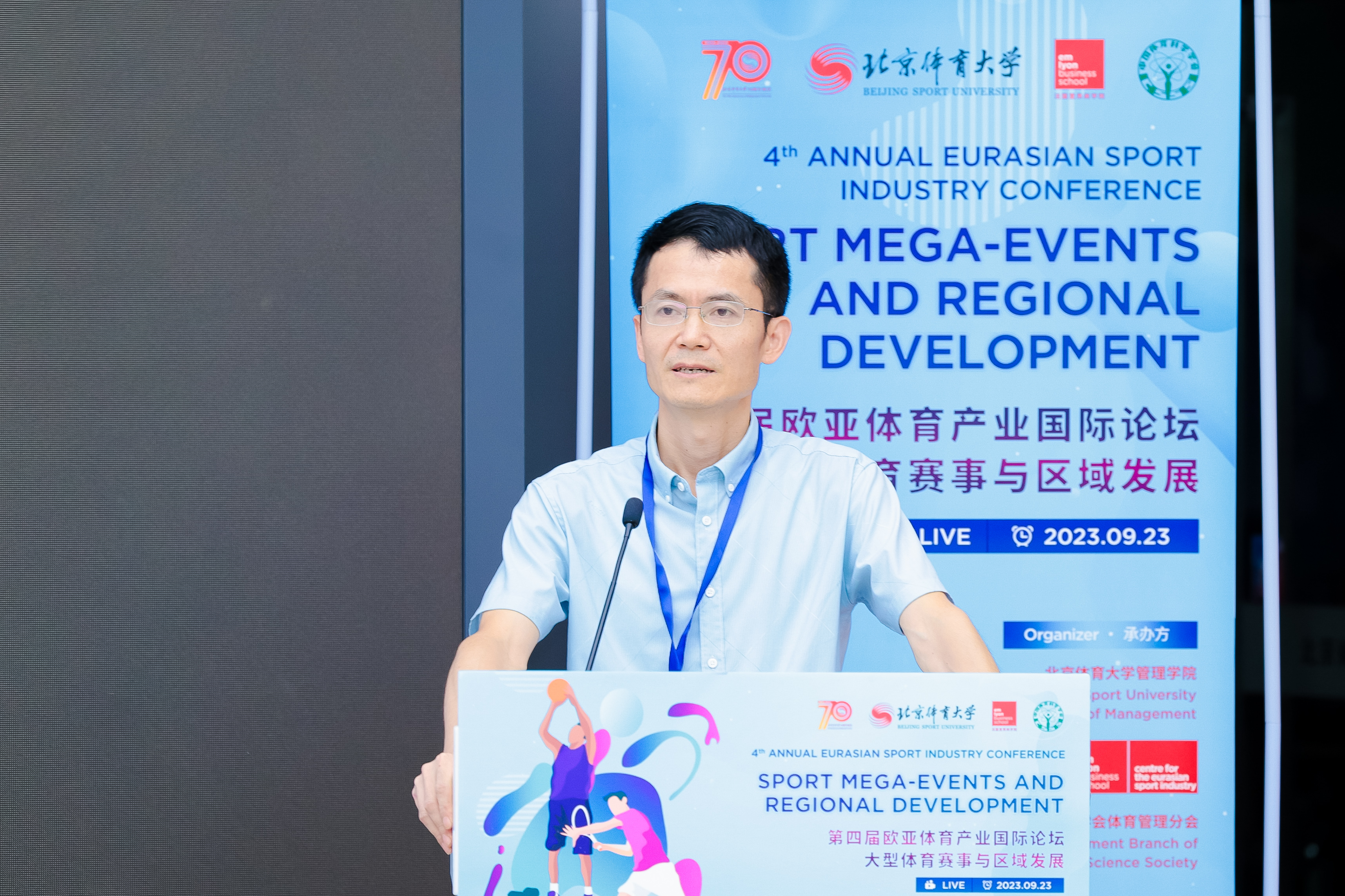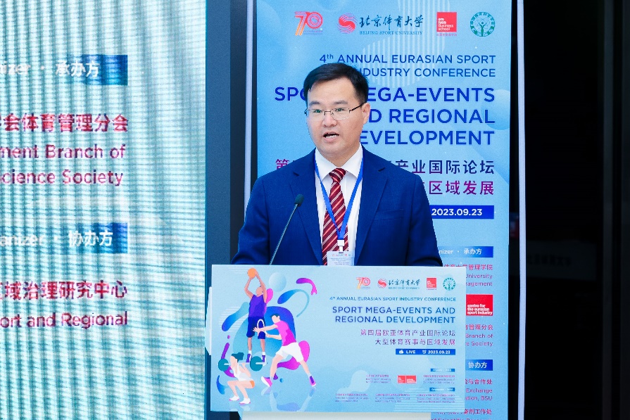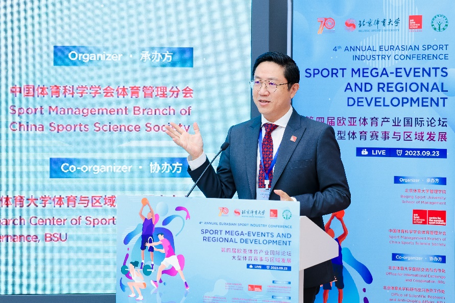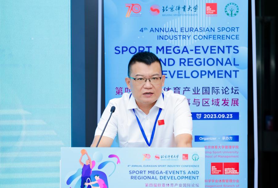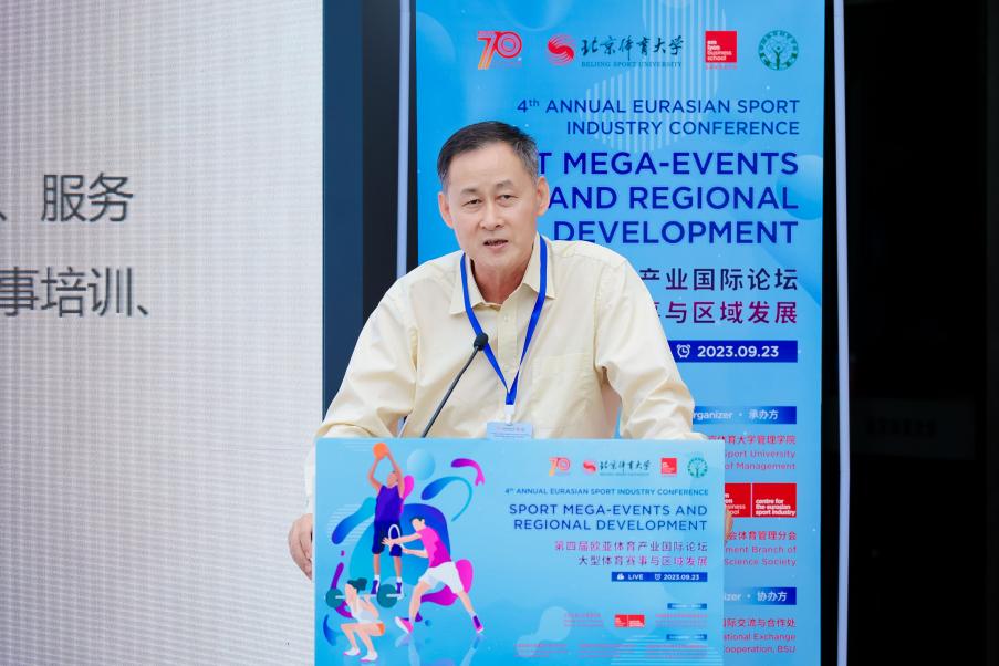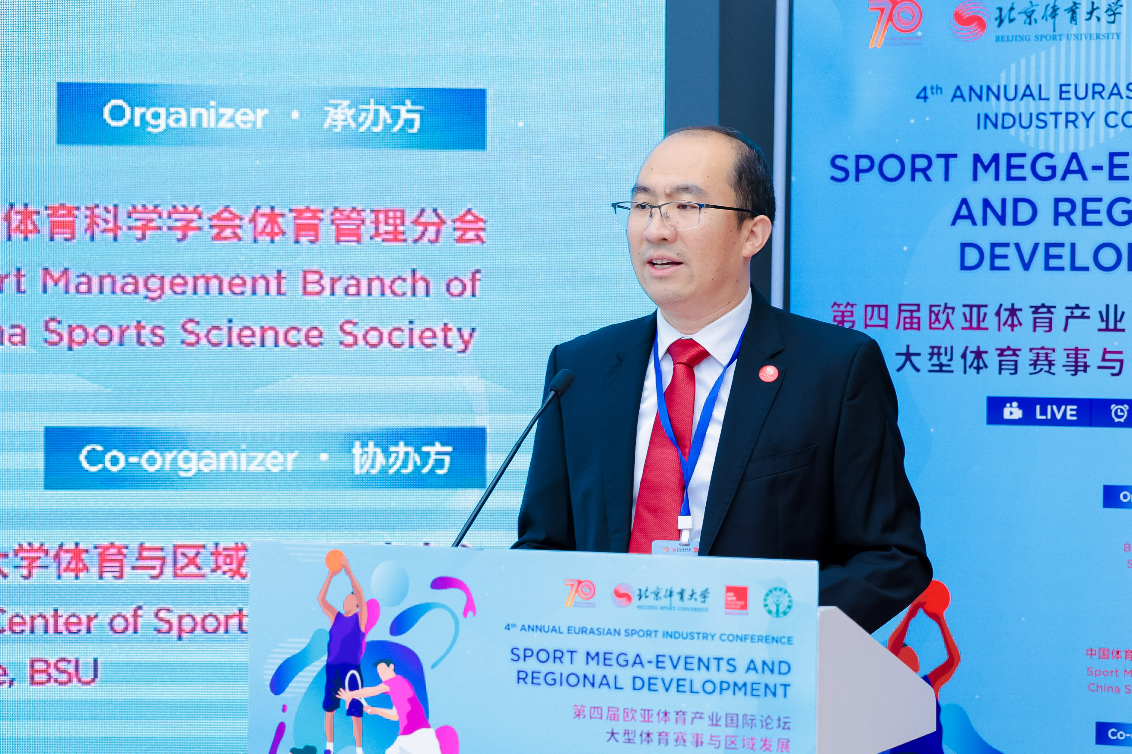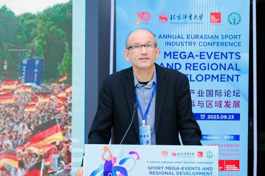 北京体育大学党委常委、副校长周启迪在致辞中向参加本次论坛的海内外专家学者、业界精英表示热烈的欢迎,向共同参与主办此次论坛的法国里昂商学院和中国体育科学学会表示衷心的感谢。他回顾了学校在为党育人、为国育才的初心使命引领下,深刻践行“追求卓越”的校训精神和“使命在肩、奋斗有我”的时代精神,面向国家任务,立足自身责任,扎根中国大地,积极参与中外交流,活跃在中国体育、奥林匹克运动的主战场,担负兴体强国、服务大局重任,为党和国家培养优秀体育人才的光荣历史。周启迪副校长指出,欧亚体育产业国际论坛的影响力正在不断扩大,其作为一个重要的交流平台,也正朝着更加开放、包容、共赢的方向发展。周启迪副校长表示,大型体育赛事的举办既得益于区域的健康稳定发展所提供的环境保障,同时也会对区域经济、文化和社会等领域的进步起着重要的推动作用。在全球化背景下,如何准确把握大型体育赛事对区域发展影响的作用机制,如何更好实现体育赛事资源的优化配置,如何不断提升区域体育产业的韧性发展水平,是当前体育产业发展面临的重大挑战。同时体育产业的高质量发展也离不开高素质的人力资本支撑,而如何从供给和需求两侧出发,实现区域体育产业人才培养与人才使用之间的有效匹配,同样需要倾听不同的声音。他希望各位专家能够围绕论坛的主题畅所欲言,为实现大型体育赛事助力区域可持续发展贡献智慧和力量。