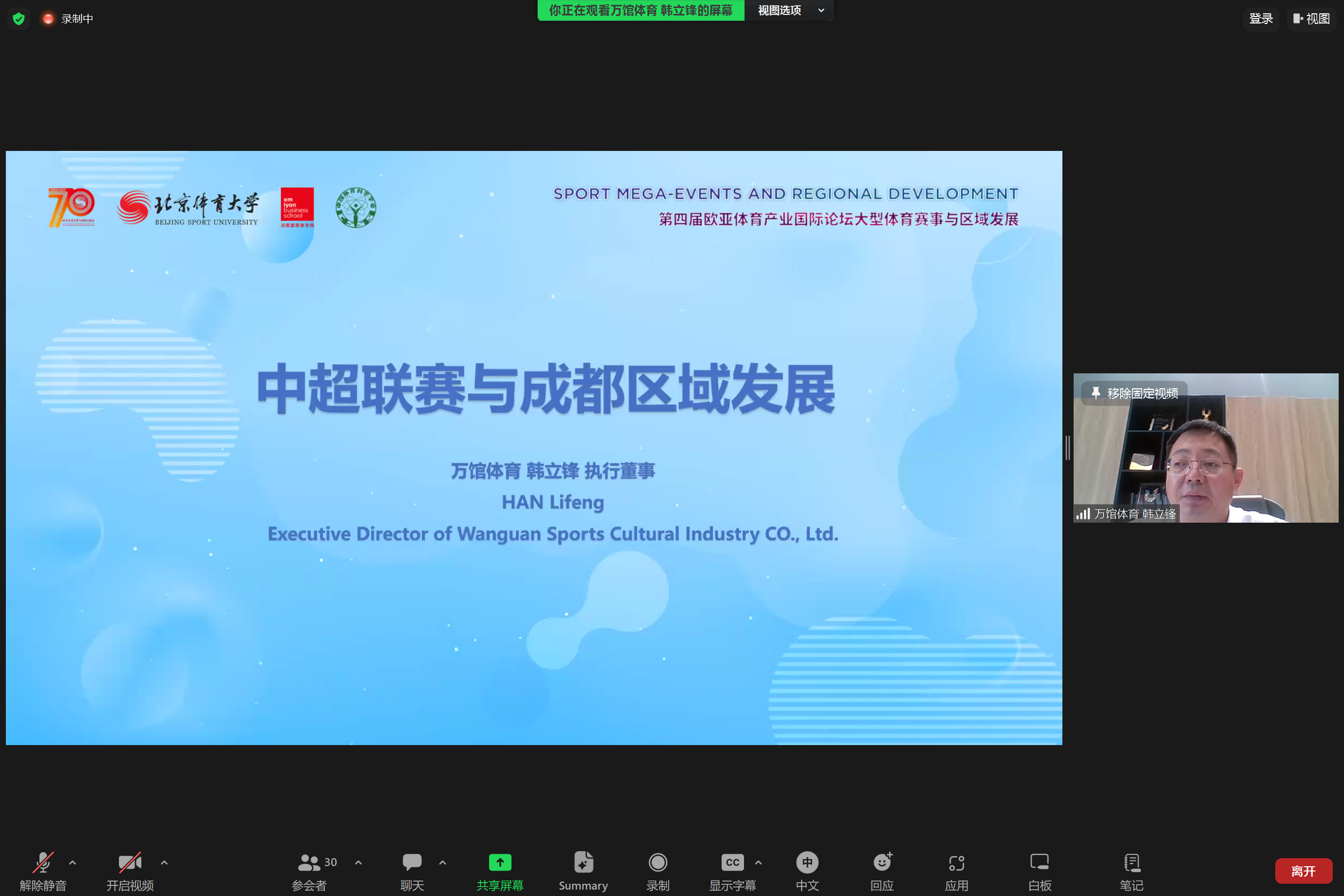 万馆体育执行董事韩立锋先生进行了《中超联赛与成都区域发展》的主题分享,他以中超联赛和2023年成都大运会为例,展现了成都完善的基础设施设备和体育运动场馆,阐述了成都举办大型体育赛事在促进城市消费升级、城市基建、媒体曝光、国际影响力、旅游、区域产业链等方面的积极作用。