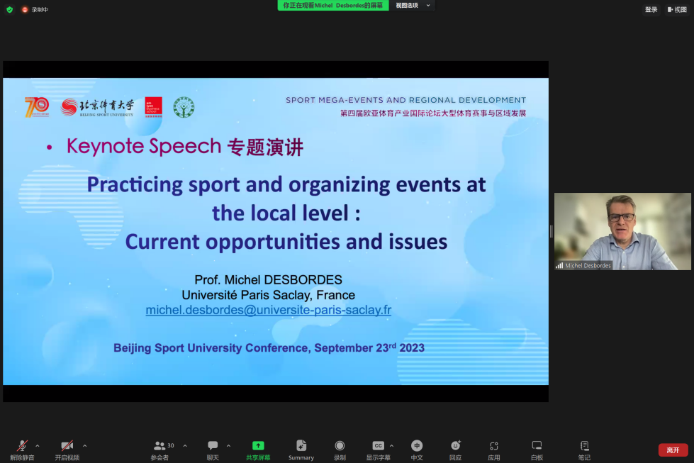 法国巴黎萨克雷大学米切尔·德博尔德(Michel Desbordes)教授通过线上视频的方式带来了《地区层面的体育实践和活动组织:当前的机遇和困境》的主题分享。他指出,地区体育赛事的举办需要考虑经济和社会的平衡发展,鼓励开展低碳运动,提高城市环境管理效果。