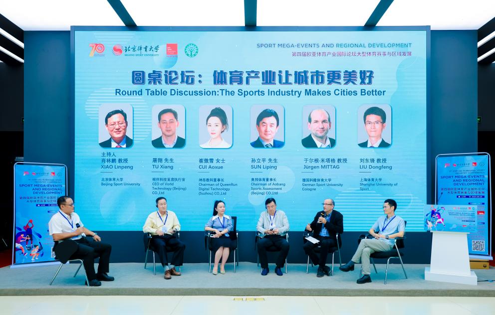 此次论坛还邀请专家学者和体育科技领域的业界精英,以“体育产业让城市更美好”为主题进行了圆桌论坛。圆桌论坛活动由北京体育大学肖林鹏教授主持,参与圆桌论坛的嘉宾分别是视伴科技首席执行官屠翔先生、坤昂数科董事长崔傲雪女士、奥邦体育董事长孙立平先生、德国科隆体育大学于尔根·米塔格教授、上海体育大学刘东锋教授。主持人和嘉宾围绕数字体育和体育产业融合、数字体育发展瓶颈和痛点、如何推动数字体育转型等议题,探讨了新时代如何发挥体育产业的作用,让城市更美好的路径与方案。