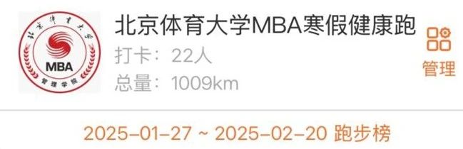 寒假健康跑活动虽已落幕,但追求健康与自律的脚步永不停歇。此次活动不仅帮助大家在寒假保持运动习惯,以积极健康的状态迎接新春,更增强了MBA师生的向心力和凝聚力,彰显了北体MBAer追求卓越的精神风貌!在此感谢所有参与者的坚持与热情!未来,北京体育大学MBA将继续以体育为桥梁,搭建更多丰富多彩的交流平台,助力每一位MBA学子在学业与人生的赛道上,跑出属于自己的精彩!让我们携手并进,共创辉煌!