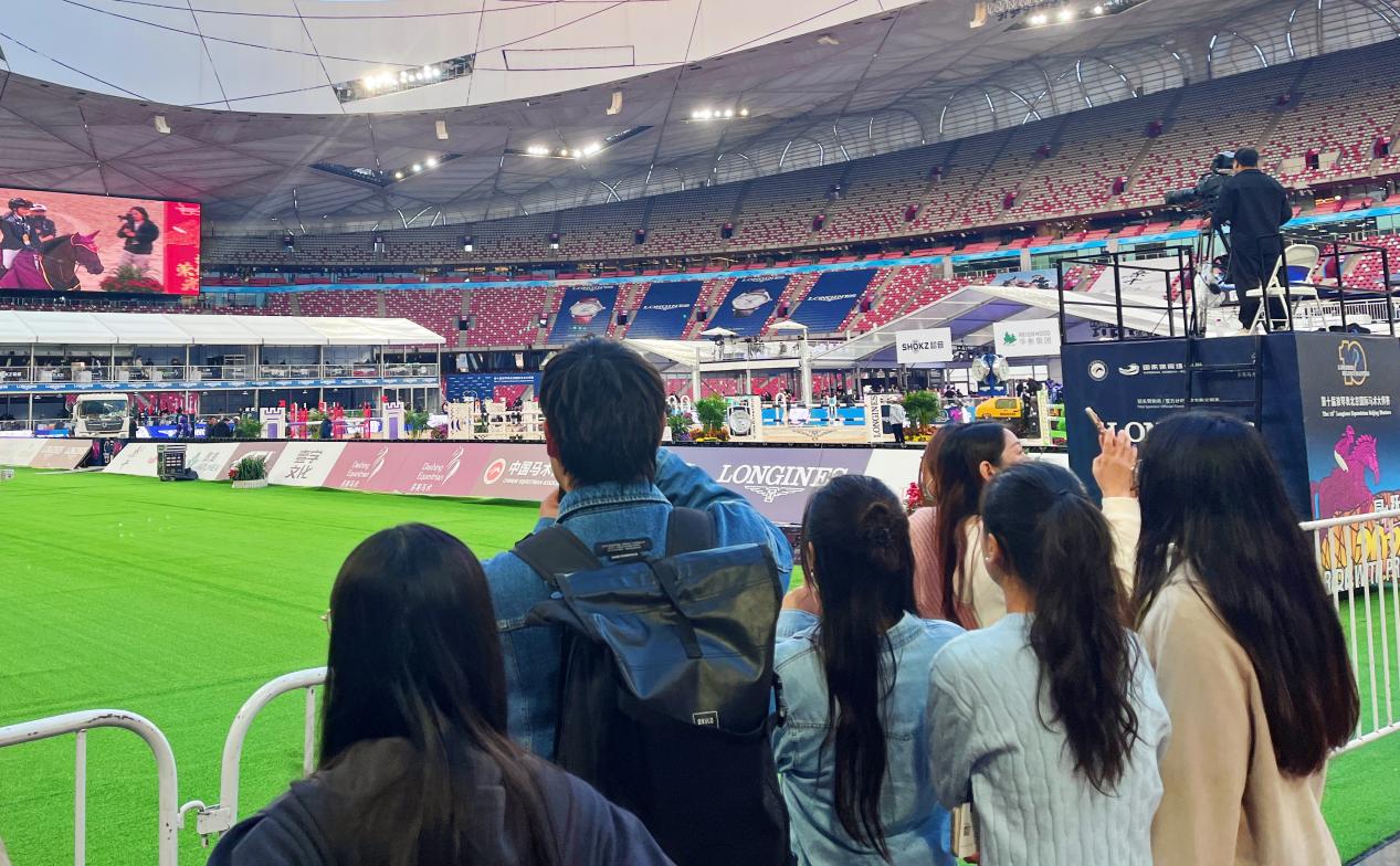 浪琴表北京国际马术大师赛始于2011年,过去九届比赛,北京国际马术大师赛聚集了50位奥运级骑手,共斩获15枚奥运金牌,记录着大师赛辉煌的过往,也是中国马术事业发展向上的印记。今天是大赛进行的第五天,公开赛(100cm)、骑士之夜和职业骑手配对赛(145cm)依次进行,同学们在这里切身地感受着国内规格最高、规模最大的马术旗舰赛事盛会,一次次被强大的骑手阵容、盛大的赛事规模和丰富的赛事体验所震撼,深刻体会到了走在前沿的国际马术浪潮的强大力量。