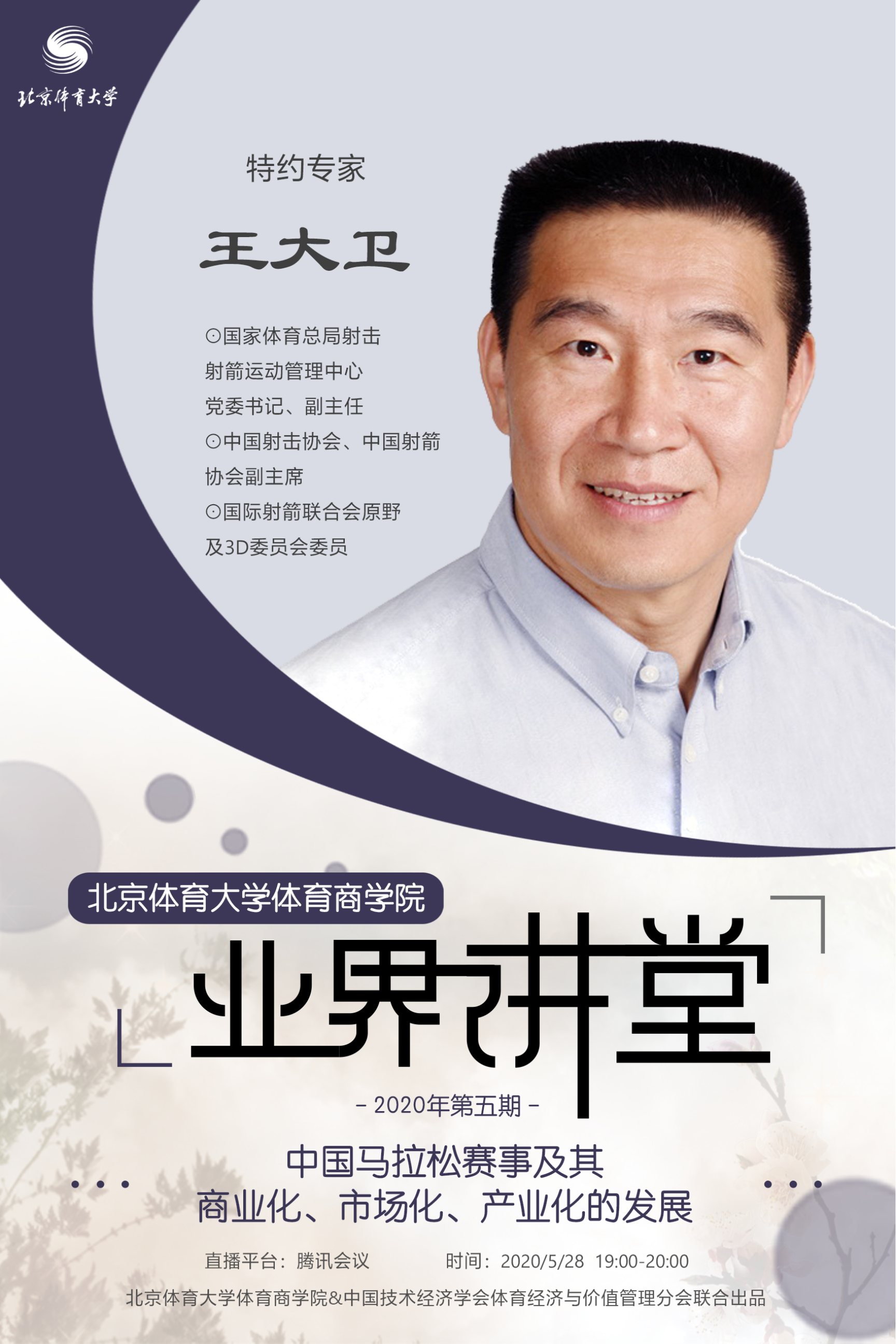王大卫,现任国家体育总局射击射箭运动管理中心党委书记、副主任,中国射击协会、中国射箭协会副主席,国际射箭联合会原野及3D委员会委员;曾任国家体育总局田径运动管理中心副主任,中国田径协会副主席,中国田径协会路跑委员会主任,国际田联老将委员会委员、越野跑委员会委员,亚洲老将田径联合会副主席,北京马拉松运营公司中奥路跑体育管理有限公司前董事长;1989年获得北京体育大学运动训练专业教育学硕士,2006年获得复旦大学复奥体育产业工商管理硕士(MBA)。