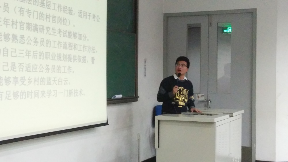徐泽伟学长目前就职于中国福特宝足球产业发展公司,他为同学们介绍了自己的工作心得和体会;我校在读研究生钱文龙学长与同学们分享了他复习考研时的学习心得与体会,更以自身的实战经验向大家提供了宝贵的学习方法和建议;晁石学长向同学们介绍了他的体育经纪人之路,并通过分析当前社会大环境鼓励同学们继续为体育事业和产业的发展奋斗;白子琳学姐则向同学们讲述了自己在求职就业所遭受的种种坎坷挫折,并一度哽咽,在场同学无不为之动容,同时也认真听取了白学姐的诚恳建议。目前就职于奥体中心的毕泽宇学长与同学们分享了他的大学计划,从出国到考研,最后毅然选择直接工作的故事,他谆谆告诫大家在工作中妥善处理人际关系的重要性;李倩学姐与孙恺林学长则具体生动地讲述了他们在担任村官期间的有趣故事,并向学弟学妹们强调了日常工作中做好小事、关注细节的重要性。