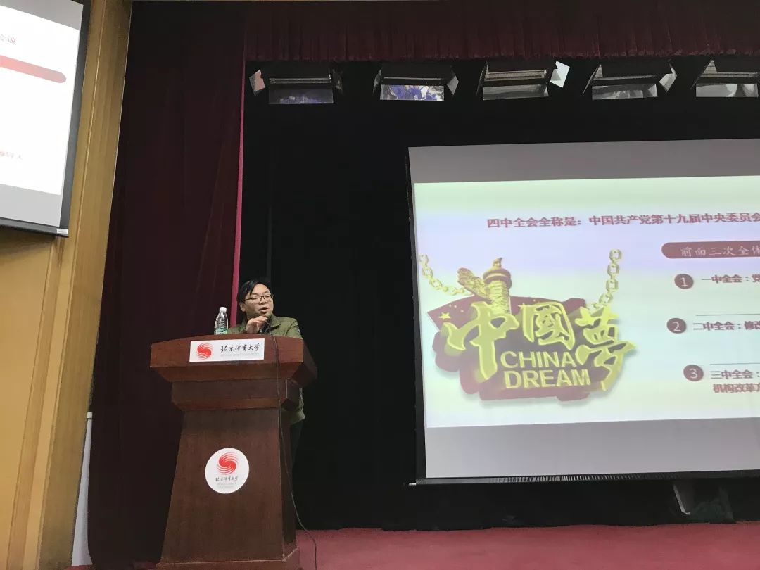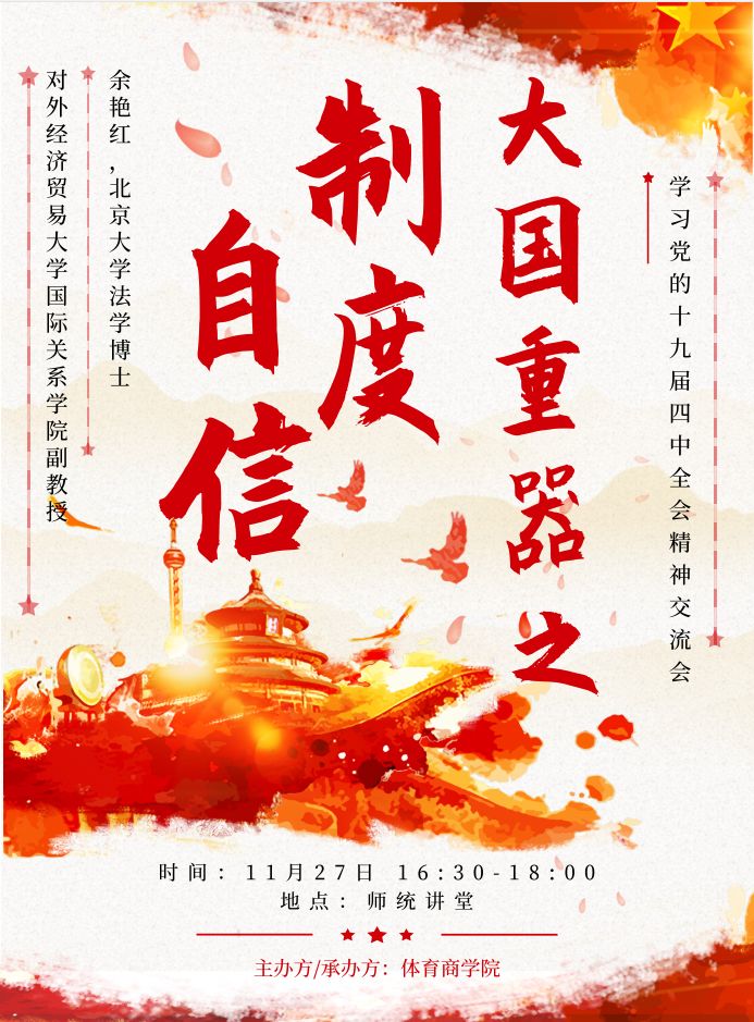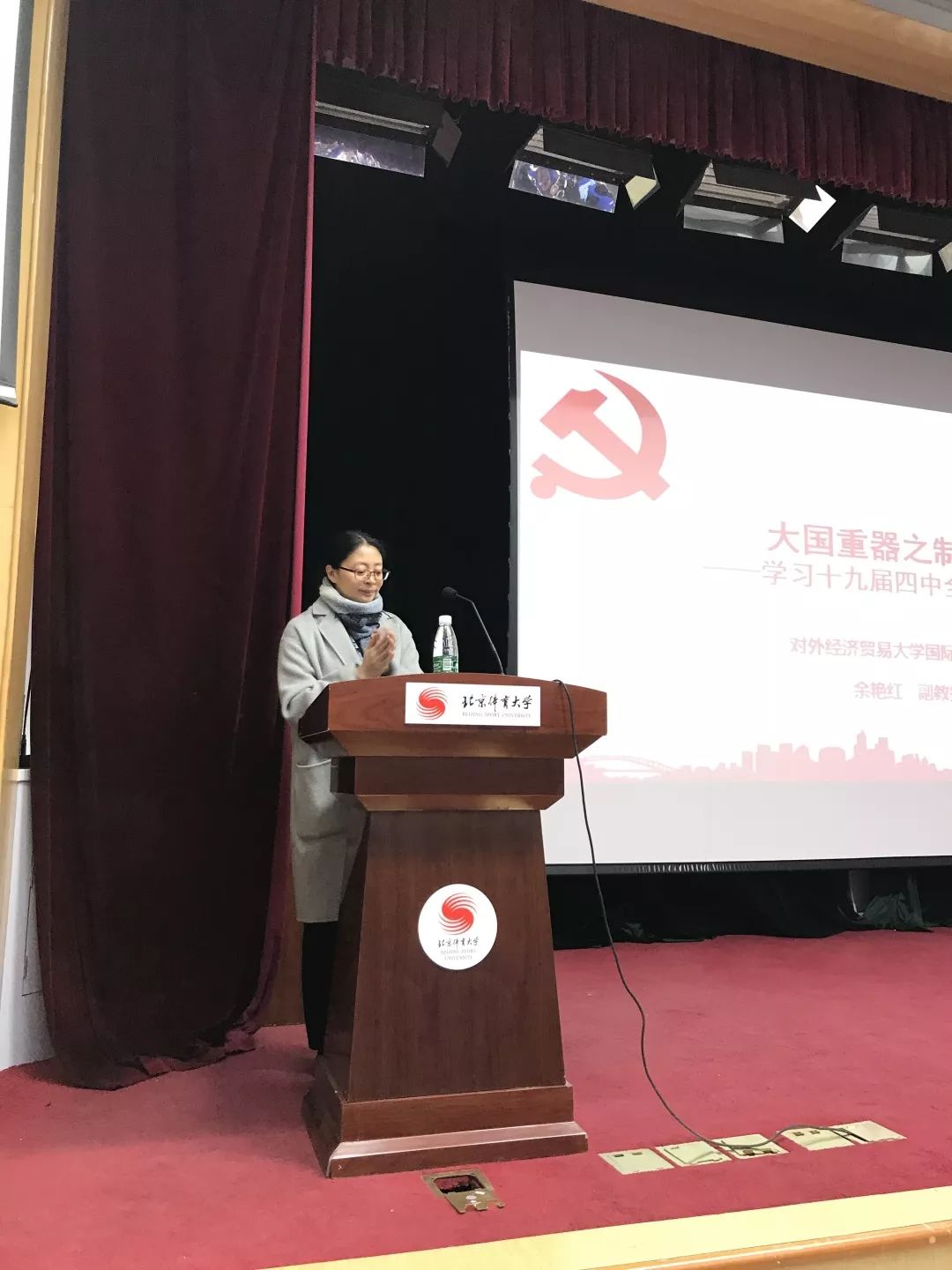 为引导学生更好地学习中共十九届四中全会精神,2019年11月27日,北京体育大学体育商学院在师统讲堂举办了中共十九届四中全会精神学习会。体育商学院党总支副书记戴旭主持讲座,在简单回顾了四中全会的召开之后,对余艳红老师进行了介绍,并表示热烈的欢迎。辅导员蒋岩岩老师、李雅雅老师全场聆听讲座。