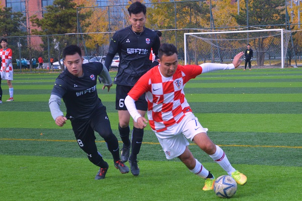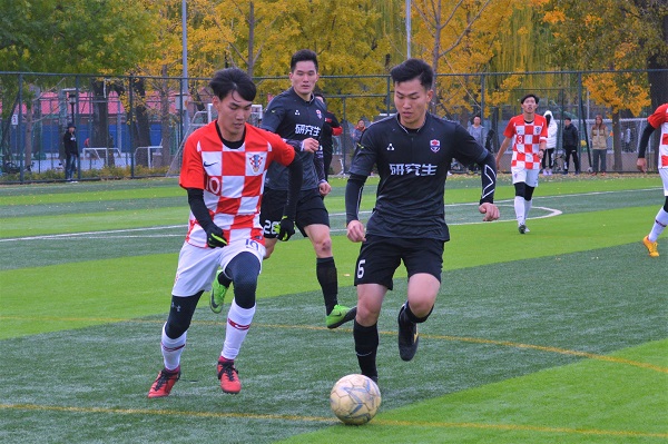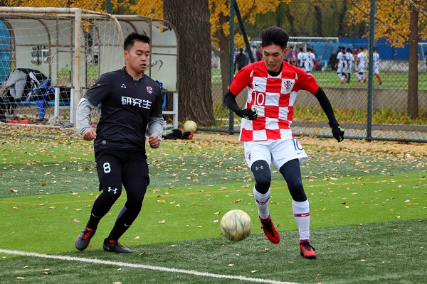 北京时间2018年11月6日星期二中午12:15,体育商学院“精英杯”足球联赛的第八场比赛在足球场3号场开赛,对阵双方为研究生男子足球代表队(下文简称“研究生男足”)与2016级男子足球代表队(下文简称“16男足”)。两支队伍在经历60分钟的激烈角逐后,以研究生男足2比1战胜16男足的结果结束整场比赛。
