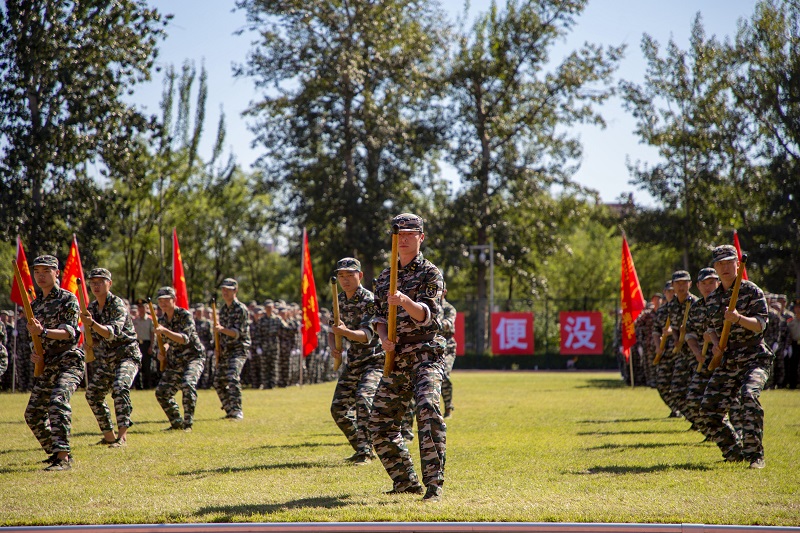 本次结营仪式的第一个环节是各方队分列式展示。各学院方阵就着激昂的音乐,神采奕奕,迈着整齐的步伐前进。以最饱满的精神面貌去接受领导和老师的检阅。方阵展示完毕后,由各方阵的优秀学生组成的连队向大家展示了擒敌拳和刺杀操。他们的动作铿锵有力,眼神坚定,让老师和同学们感受到了一个兵的气魄。而后则是由武警大队带来的军事科目汇报表演。军人严肃认真、铁骨铮铮的形象完完全全展现在大家眼前。特警们表演了头砸酒瓶、手劈砖头等高难度动作,让大家看得瞠目结舌。尤其是警犬展示,军犬扑咬表演让人不禁捏了一把汗。这项表演也更是将检阅的气氛推到高潮。
