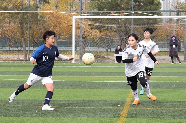 比赛伊始,18女足带着初生牛犊不怕虎的冲劲率先发力,10号韩宜珍带球突破直奔球门,与此同时16女足紧密防守,以至18女足未寻得破门良机。紧接着,18女足31号董嘉慧穿裆过人带球直冲禁区,16女足又一次联合防守。比赛进行到第13分钟,18女足表现出惊人的团队协作力,持续配合传导将球传到禁区中路,并由27号陈家慧一脚破门,18女足先发制人拿到1分,此时场上比分1:0。接下来的比赛中,双方胶着对抗,攻防有度,到上半场结束18女足1:0暂时领先16女足。