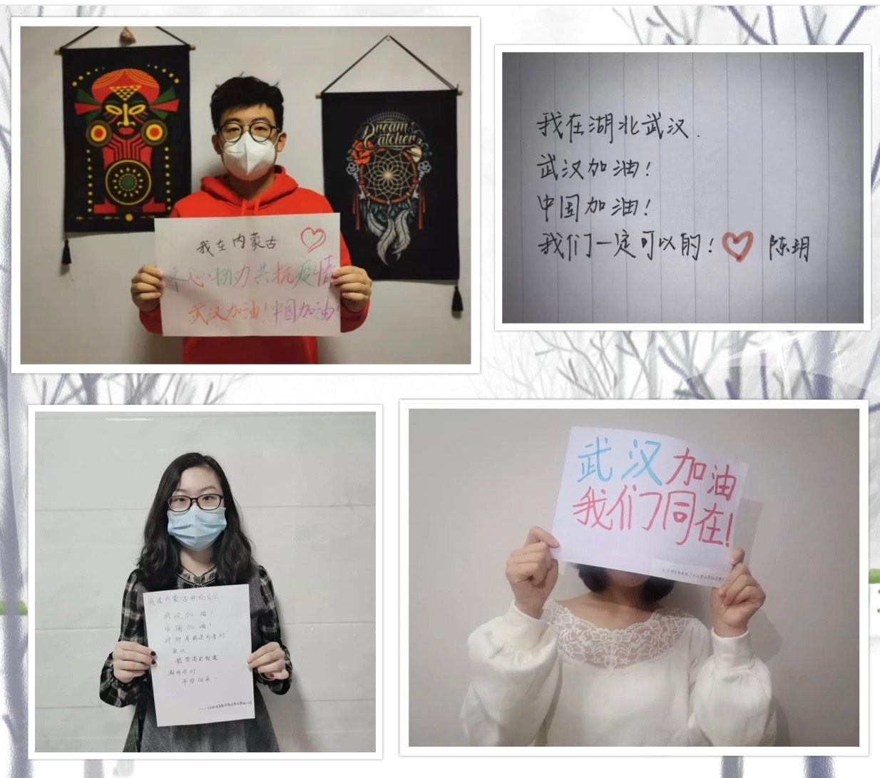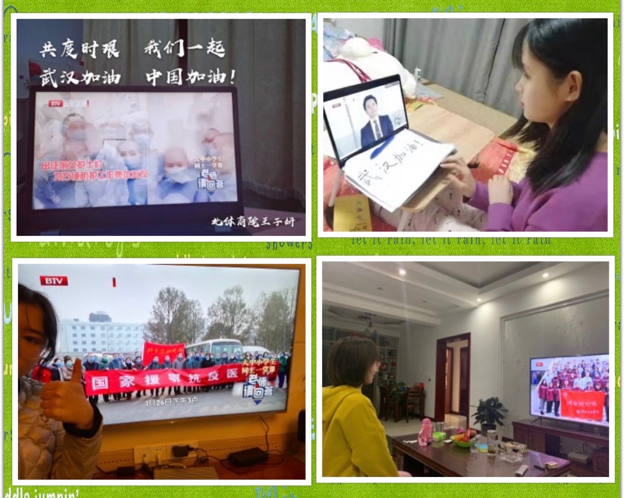 各班积极组织开展了“同上一堂课”活动,认真学习收看了由北京市委教育工委、市教委与北京电视台共同推出《老师请回答》电视公开课,了解道疫情中众多最美逆行者的事迹。除此之外,各班还别出心裁的组织了许多精彩活动,如经管一班的爱心九宫格拼图和加油视频;经管二班以接龙签名的形式公开承诺;经管三班讲述了抗疫中的感人故事;冰雪班手写“武汉加油”的词牌,制作武汉加油小视频;经济学班的学生抒发了对前线的祝福。
