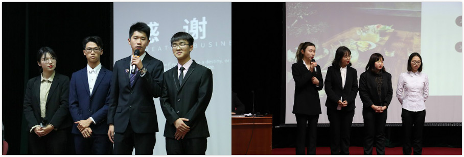 比赛正式开始,主持人介绍了赛制后,首先登场的是行成国际案例题目下的 “红鲤鱼与绿鲤鱼与驴队”,他们提出了“百年行成”的构想,并在现场发放了“冰球+留学”的海报宣传单。行成国际的评委老师针对他们的表现进行了提问,并对他们方案的全面性和专业性给予了一定的肯定。第二队上台的是“羽羽羽羽琴队”。两队展示结束后,马天平老师进行点评,他肯定了个人参赛的饶羽琴同学的勇气,分享了“与其更好,不如不同”的感悟,并期待同学们更多的挑战和创新。康比特题组两队选手进行展示后,韩华老师从专业学习角度对选手进行点评,她对选手的精美策划与专业分析表示了肯定,也鼓励选手进一步完善不足之处,将营销策划方案嫁接到实际运用之中。啪啪运动题组的两支队伍讲演结束后,进行了同学们期待已久的抽奖环节,由秦维聃老师开奖送出了两只Mac口红。随后众辉体育和北体产业题组对应的四支队伍依次上台,呈现了各自精彩的方案设计。