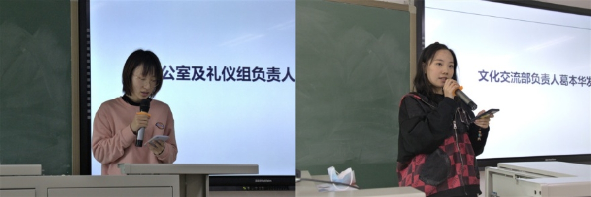 在李雅雅老师致辞后,由部长们为新成员介绍其负责任务的注意事项。办公室礼仪组组长张仕陶介绍了物资购买的注意事项以及开发票与报销流程。文化交流部部长葛本华介绍了借教室与场地流程,宣传部部长胡贝石介绍了图书馆及文印室复印相关要求。部长们细致的讲解加深了部门新干事对工作流程的更深了解。随后,由李雅雅老师为团总支学生会的主席团成员及部长级成员颁发聘书。