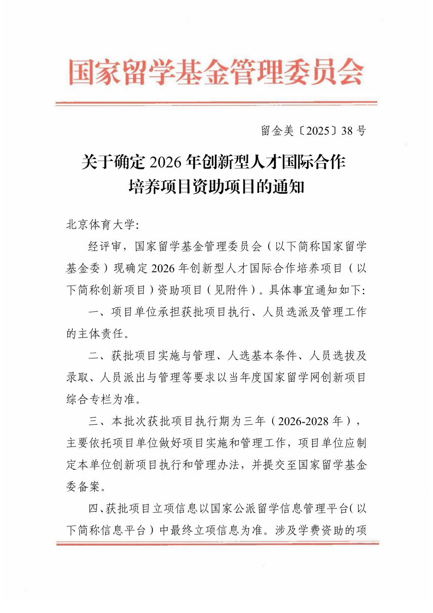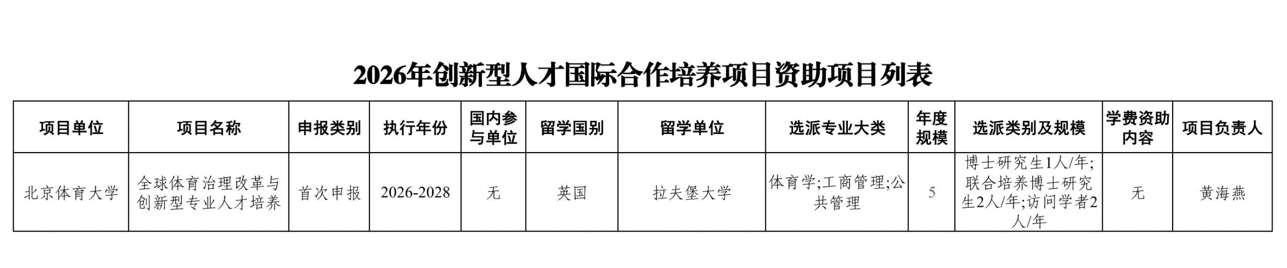 近日,国家留学基金管理委员会公布了2026年创新型人才国际合作培养项目资助名单,由北京体育大学统一组织、管理学院牵头申报的“全球体育治理改革与创新型专业人才培养”项目成功获批。