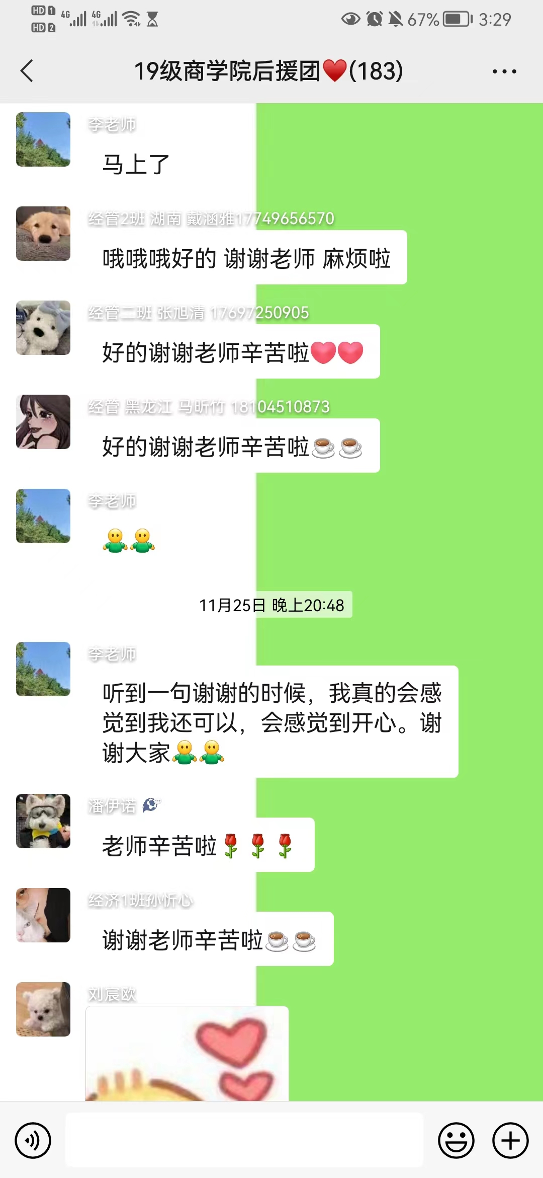 朱双利、田思、王子腾、邹承尧、钟权瑜、杨蔚怡、廉方池、王景怡、张培、乔嘉宁、魏雨乐、费月、赵奇、张梅婷、倪瑞丰、荣梓安、林意婷、王一翔、彭水、高京晶、缪云峰 赵雨曦等数十名学生党员、入党积极分子、学生骨干积极响应学院党总支号召协助推进抗疫工作,担起楼层长、志愿者重任,及时传达各类信息,将每日三餐、生活用品、抗疫物资消杀完毕后送到同学们手上,他们不仅发挥了学生党团员的先锋模范作用,更彰显出了新时代青年学子的担当和力量。
