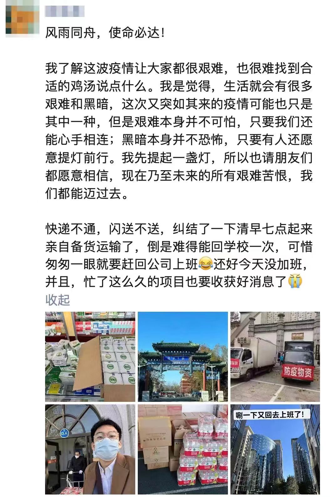 还有和我们风雨同舟的校友,听闻母校抗疫处于关键时刻,伸出援手,用真情温暖了母校和学弟学妹们。没有快递,就自己雇车,没有货源,亲自到药店、超市采购,一切困难都不能阻挡他为母校奔赴而来。