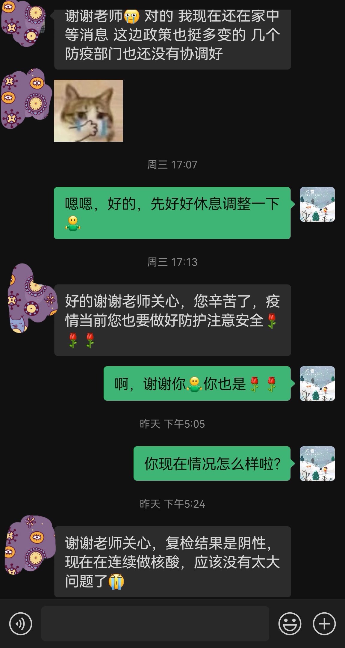 学院为每个班配备联络教师,“点对点”建立辅导员、联络教师“双负责”防控联动机制,畅通沟通反馈渠道,帮助解决同学们遇到的问题,开展心理疏导,引导学生正确对待疫情、科学有效防控,强化共克时艰的信心和决心。