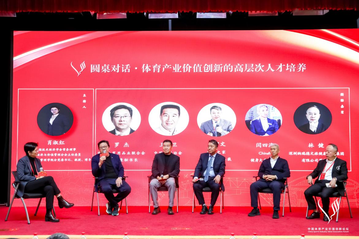 圆桌对话环节分两场进行。首场由体育经济与价值管理分会主任委员、北京体育大学管理学院分党委书记肖淑红教授主持,中国体育用品业联合会副主席兼秘书长罗杰,中国射箭协会副主席王大卫,中国国际露营大会执行主席、露营之家TOP计划总裁李守文,Chinafit健身大会总经理闫四海,深圳纳瑞德文旅健康产业集团有限公司、海南金健宇健康医疗产业集团董事长林健五位嘉宾就“体育产业价值创新的高层次人才培养”议题进行分享交流。