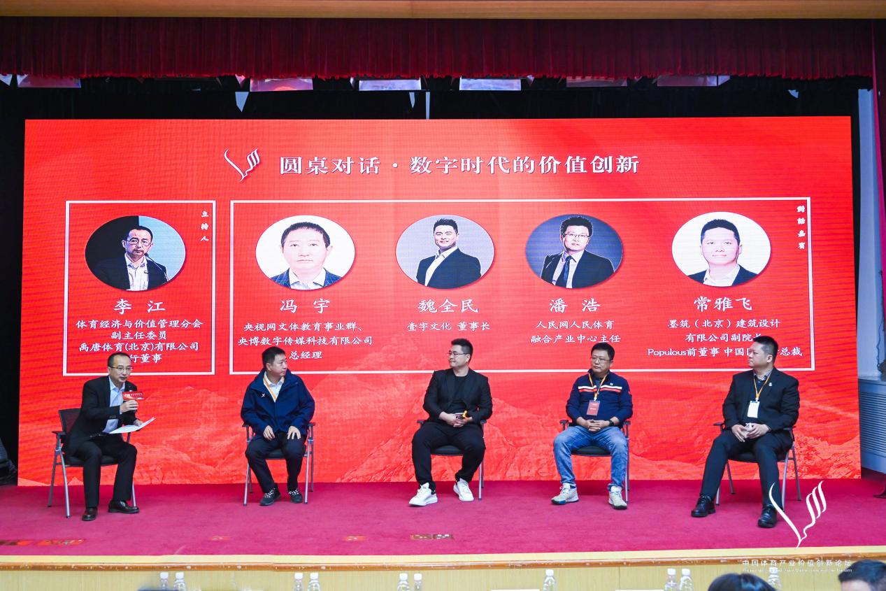 第二场圆桌对话主题为“数字时代的价值创新”,体育经济与价值管理分会副主任委员、禹唐体育(北京)有限公司执行董事李江担任主持,央视网文体教育事业群、央博数字传媒科技有限公司总经理冯宇,壹字文化董事长魏全民,人民网人民体育融合产业中心主任潘浩,墨筑(北京)建筑设计有限公司副院长、Populous前董事、中国区执行总裁常雅飞四位嘉宾分别结合各自企业实际发展情况,讨论新时代体育产业价值创新的核心要义,擘画以共同价值成长为核心的体育产业生态蓝图。