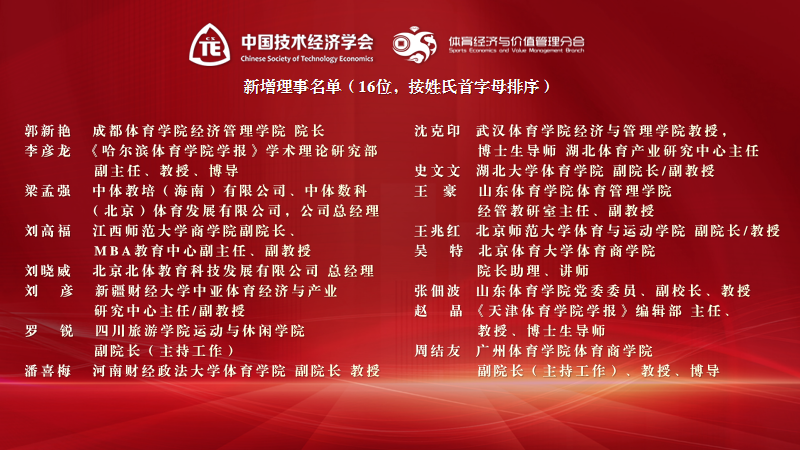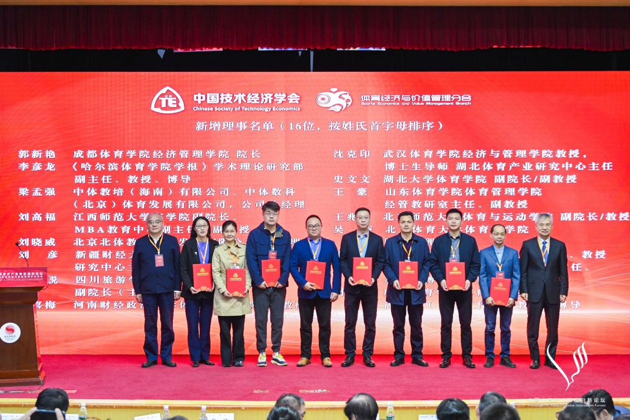主旨演讲后,李平理事长和张健副校长为中国技术经济学会体育经济与价值管理分会的新增理事代表颁发证书。本次理事增补经分会主任委员、副主任委员提名,分会理事推荐及自荐三种方式遴选和产生理事人选,通过学会秘书处及各单位对拟增补候选人的工作业绩和研究成果审查以及理事会会议投票选举,决定并形成最终名单,16位学界业界专家当选(按姓氏首字母排序)。