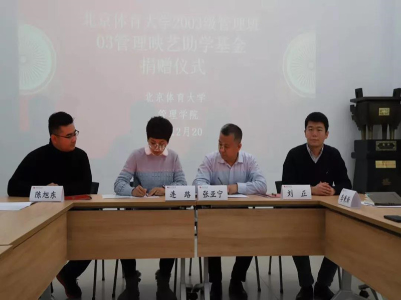 2019年12月20日(星期五)上午10:30,管理学院2003级管理班向北京体育大学教育基金会捐赠“03管理映艺助学基金”仪式在管商楼二层会议室举行。管理学院分党委书记张亚宁,北京体育大学教育基金会副秘书长刘正,管理学院2003级管理班捐赠人代表连路、陈旭东,管理学院团总支书记李秉新,管理学院辅导员石阳君、聂上钦出席捐赠仪式。