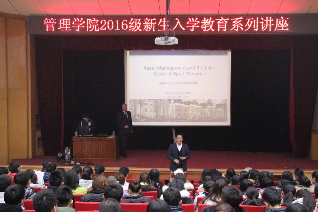 201714日上午,管理学院2016级新生入学教育系列讲座顺利召开。在学校外事处的安排下,全体学生有幸聆听了荷兰建筑学与建筑工程硕士Henrri先生的讲座,主题为“体育场馆的营销与运营”。Henrri先生作为凯迪斯公司的首席顾问官,在资产管理、不动产的规划与创新以及设备管理上具有丰富的经验与卓越的成就。外事处副处长花勇民老师、管理学院2016级辅导员李秉新老师出席了本次活动。