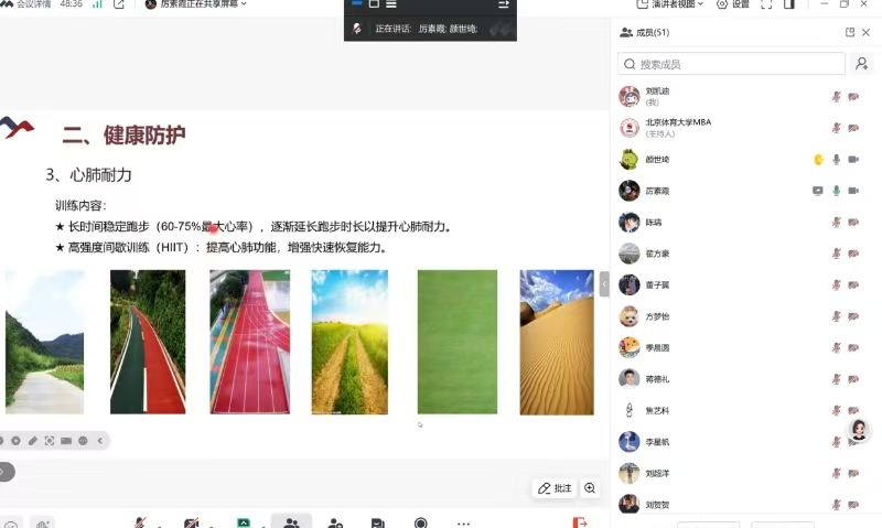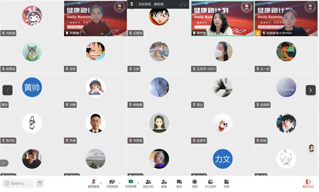 2025年1月26日,北京体育大学MBA项目成功举办了寒假健康跑启动仪式。此次活动以“健康新年、奔跑未来”为主题,汇聚了MBA项目的两届学生和特邀嘉宾在云端共同为这场充满活力与希望的健康计划揭幕。启动仪式由MBA项目办公室副主任颜世琦主持。
