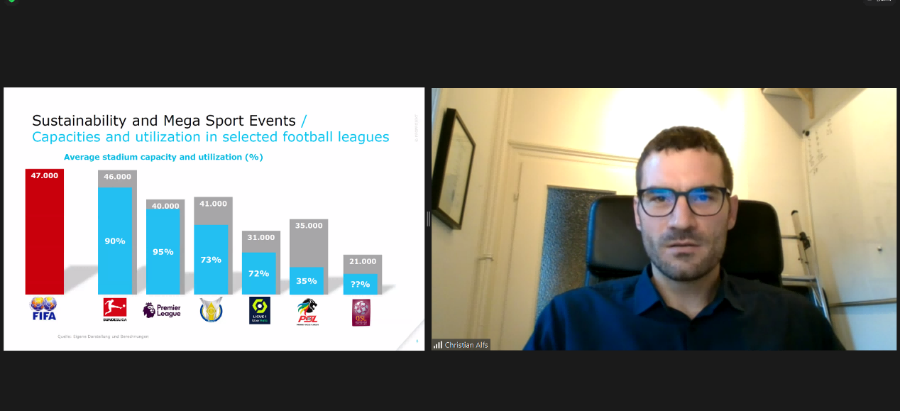 论坛第二个主题是中欧视角下的大型体育赛事 ,欧洲体育发展与休闲研究学院的高级副研究员提尔·穆勒-绍尔博士(Till Müller-Schoell)担任主持人。来自德国美因茨约翰内斯古滕贝格大学的高级讲师克里斯蒂安·埃尔法斯(Christian Alfs)博士以卡塔尔世界杯足球赛为例,通过大量的数据比对分析了大型体育赛事和可持续发展的关系。