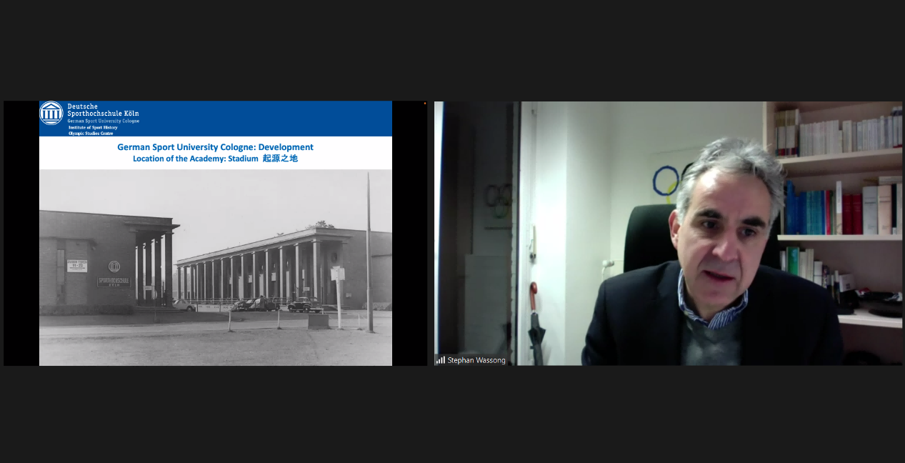 论坛分为三个主题,第一个主题是科隆体育大学和北京体育大学校庆庆典和遗产主题报告,本环节由欧洲体育发展与休闲研究院院长于尔根·米塔格教授(Jürgen Mittag)主持。国际奥委会奥林匹克教育委员会委员、德国科隆体育大学体育史学院院长施特凡·瓦松教授(Stephan Wassong)从历史的角度全面回顾了科隆体育大学自1947年以来的75年发展之路,他以数据和事实说明了科隆体育大学是如何实现从单一的体育学学位的学院发展成为多学科的大学。