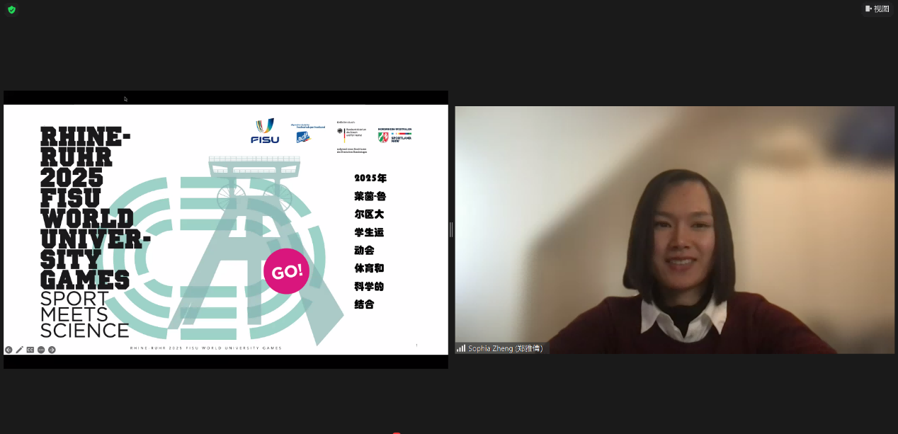 2025年德国莱茵-鲁尔区世界大学生运动会项目高级经理郑雅倩则以《2025年莱茵-鲁尔区大学生运动会: 未来主办大型体育赛事的新形式》为题,总结分析了国际大体联(FISU)选址莱茵-鲁尔区的原因,重点介绍了第32届大运会的主办理念,尤其是其场馆、住宿、交通和遗产利用方面的新理念。