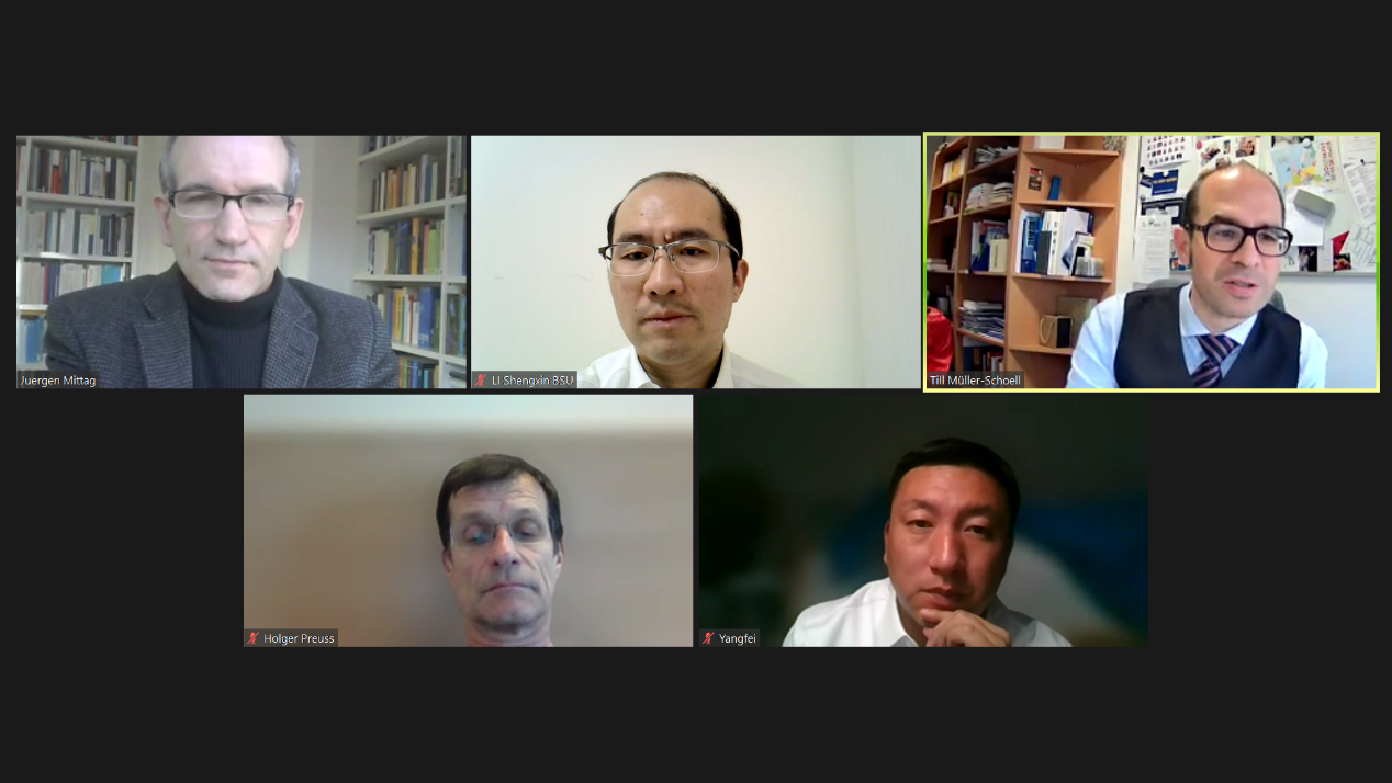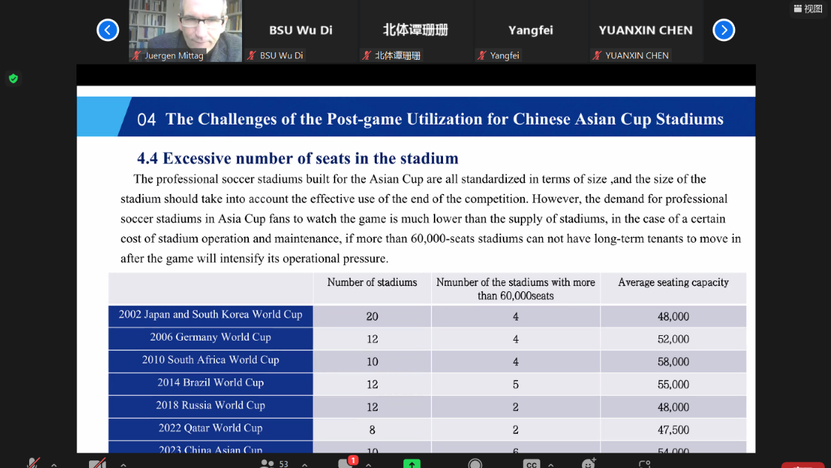 在圆桌讨论环节,来自德国美因茨约翰内斯古滕贝格大学的豪格·普罗伊斯(Holger Preuß)教授、科隆体育大学的米塔格教授、提尔·穆勒-绍尔副研究员和来自中国的杨飞副教授、李圣鑫教授围绕后疫情时代大型体育赛事的发展和遗产的持续利用,尤其是2023年后中国体育赛事和体育产业发展进行了深入讨论。