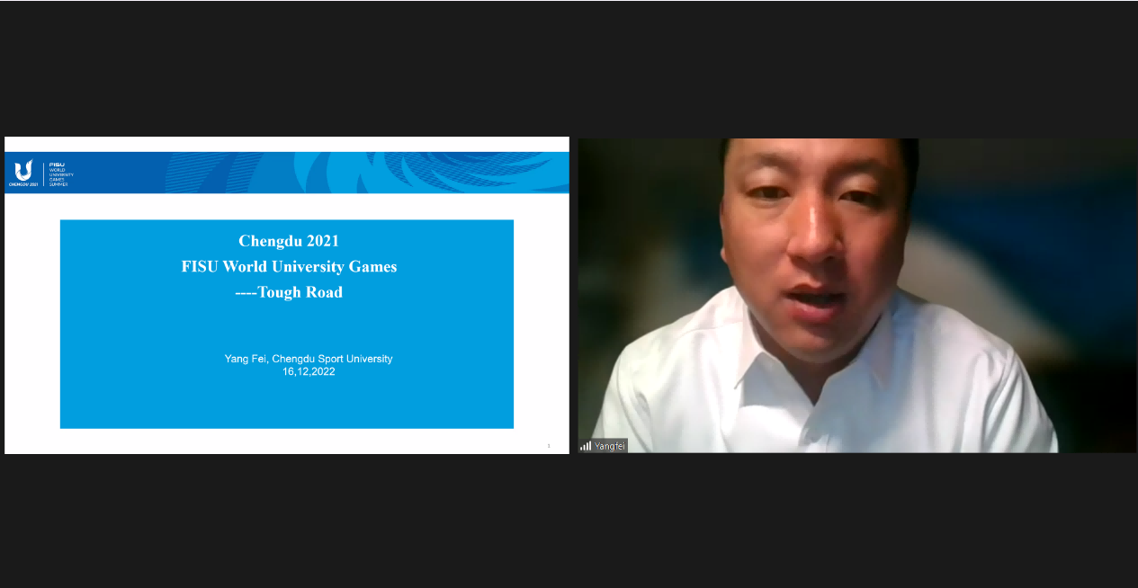成都第31届大运会执委会竞赛部培训服务处处长、成都体育学院国际合作处副处长杨飞就成都大运会的场馆建设与竞赛组织工作进展进行了报告,他强调成都大运会筹备不易,特别是因为疫情原因,成都大运会两度宣布延期,这对大运会的筹备工作和竞赛日程的确立带来了巨大的挑战,但成都也为大型赛事筹备提供了良好的参考经验。