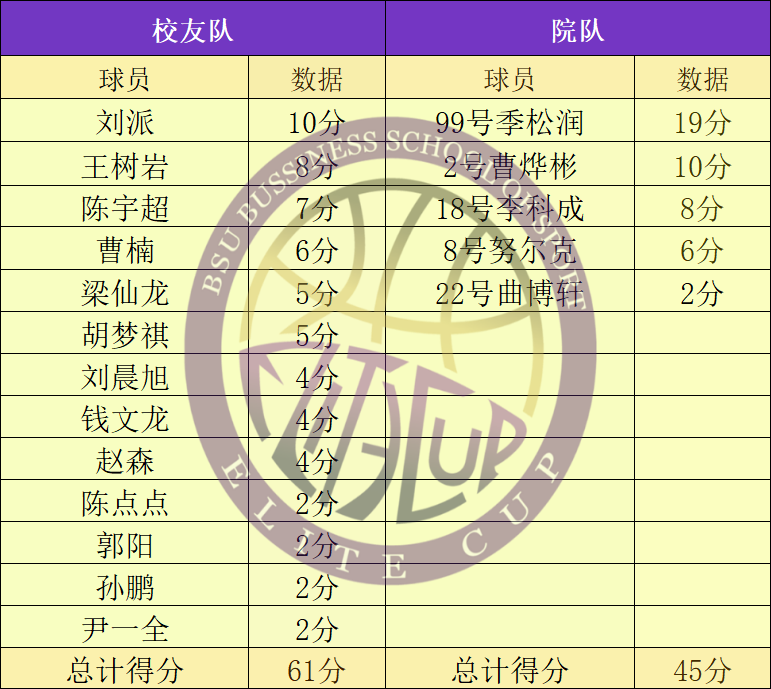 第四节比赛开始,校友队连续配合,内线刘盼接球后分给右路边线王树岩,后者底线远投三分命中!随后校友队继续进攻,王树岩接球后直接投篮,又是三分!连续两次三分命中!院队男篮加强进攻,99号季松润接队友传球后跳投不中,随后18号李科成跟进上篮得分,继续追分。随后双方长时间互攻无果,院队男篮多次进攻投篮都差之分毫。随后校友队陈点点投篮命中,再得两分。紧接着校友钱文龙又抢得篮板发起快速反击,独自带球连续突破,凭借两次转身摆脱对手上篮得分!丢球后院队男篮获得球权迅速反击。18号李科成带球随后交给99号季松润,后者起身三分命中!而校友队王培君接队友底线发球后转身潇洒长传,刘景旭接球后上篮得分,校友队继续保持领先优势。而院队男篮99号季松润状态火热,左侧45°再次三分命中,连得六分!紧接着院队男篮继续追分,李科成抢得篮板后快传,前方努尔克接球后上篮得分,打出精彩反击。距离全场比赛结束还有3分钟,校友队9号接球后投篮命中,并且持续对院队造成威胁。随后校友队连续斩获得分,在队友的连续配合和掩护下,孙鹏转身投篮,稳稳命中,校友队领先优势进一步扩大。比赛最后时刻,院队男篮仍旧没有放弃,不断加强进攻,8号努尔克接曲博轩传球后独自突破力压对手上篮得分,随后99号季松润造成对手犯规罚球得分。丢球后校友队快速反击,分边交给梁仙龙,后者突破上篮得分。最后10秒,校友队梁仙龙传球交给王培君,后者上篮不中,随后郭阳补投将得分锁定在61分。